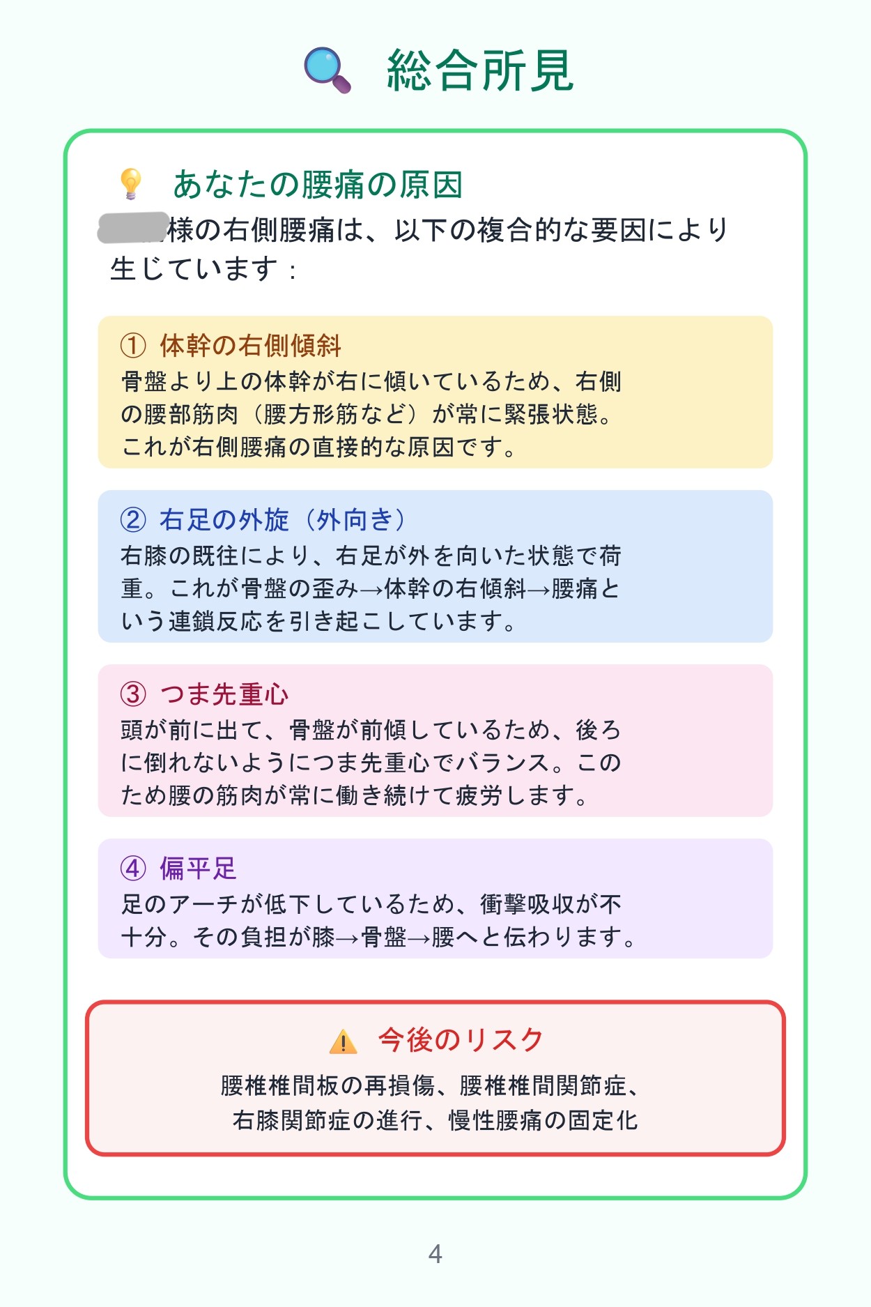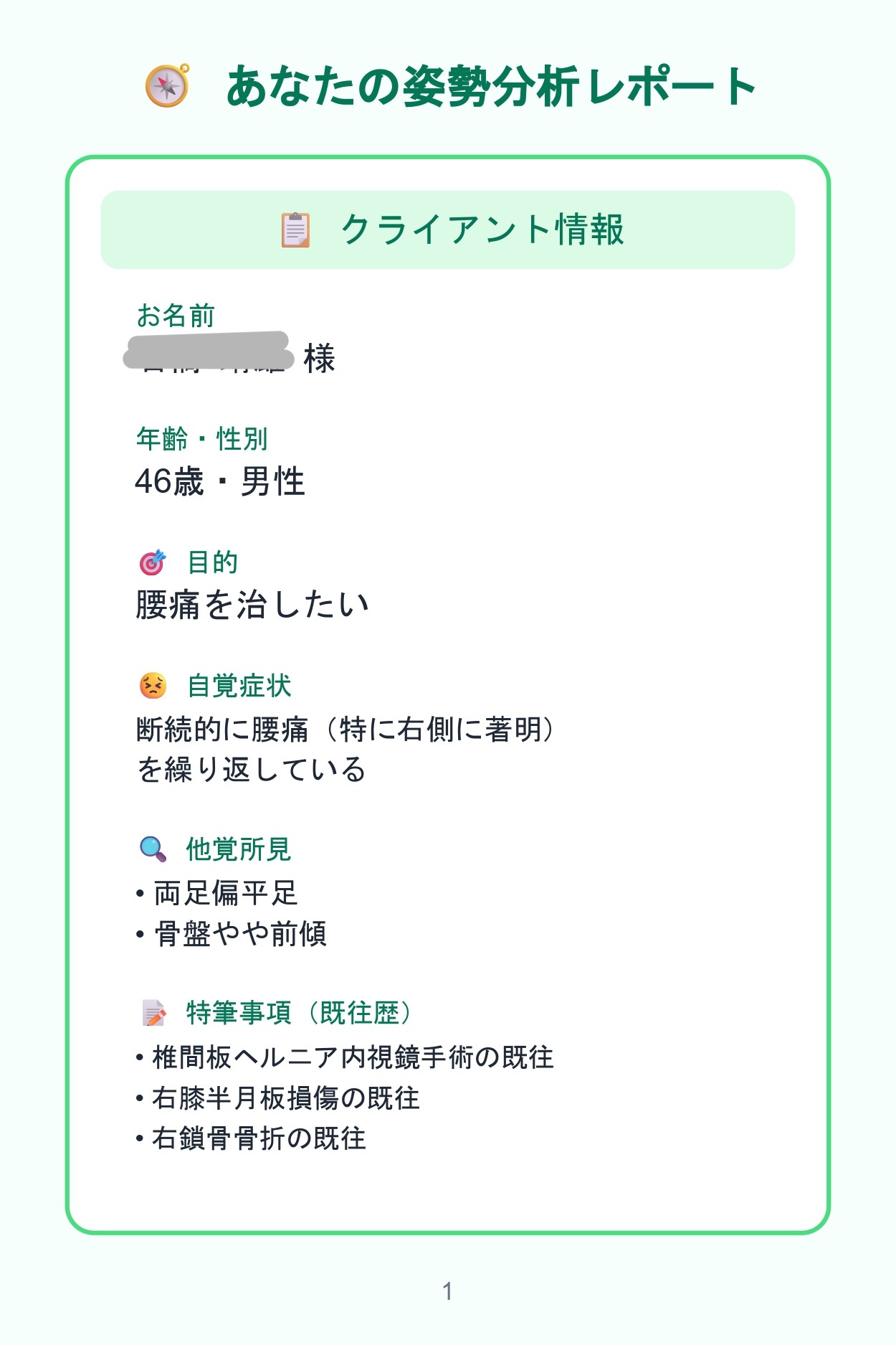 これらの情報は、後のページで「なぜ今の姿勢になったのか」「なぜ痛みが出るのか」を解明する重要な手がかりとなります。