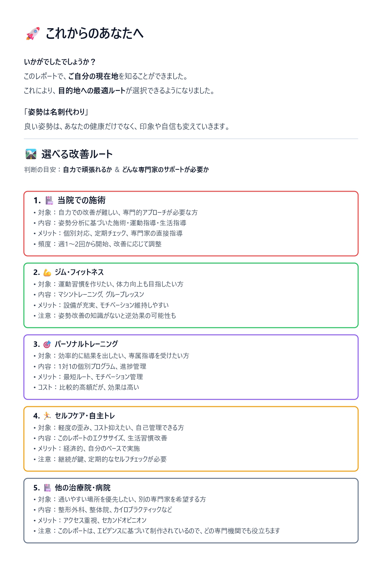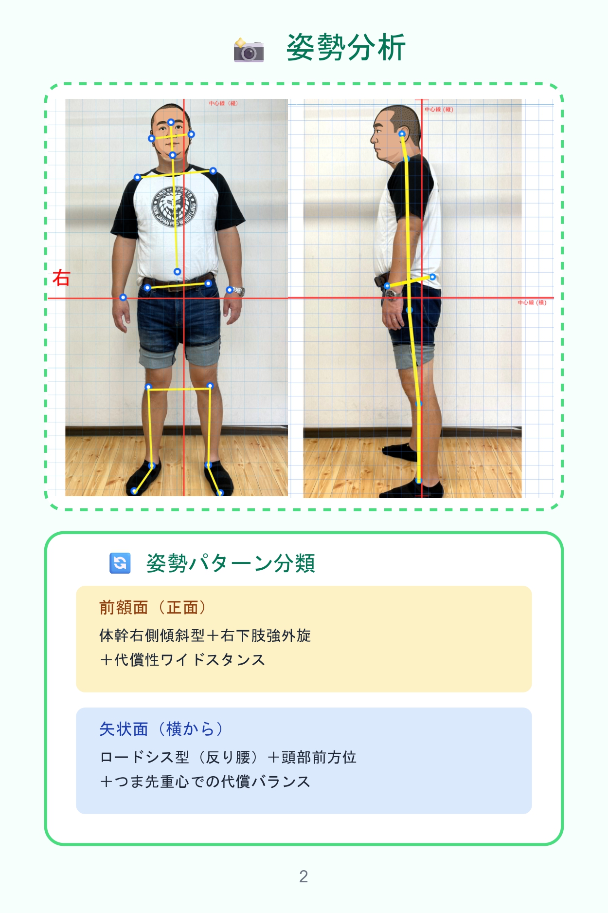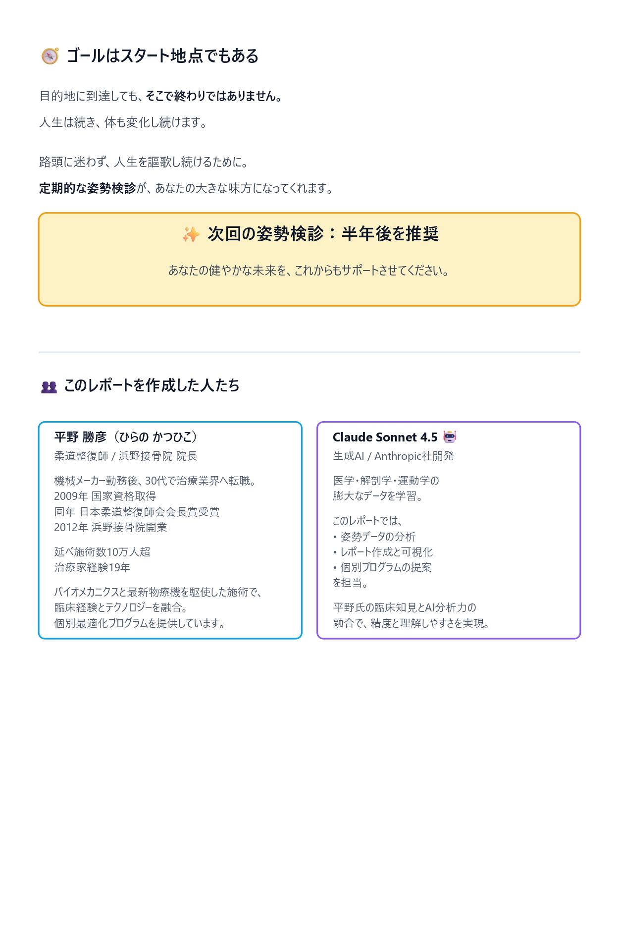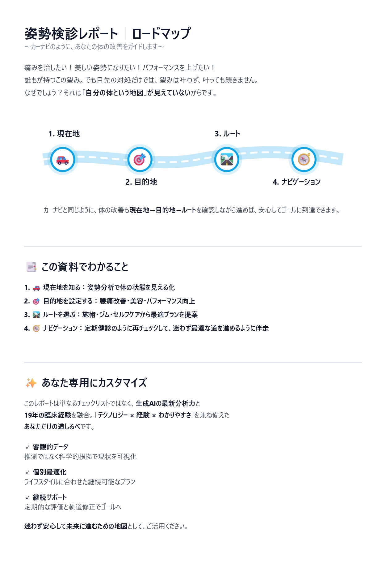 本日は、この「AI姿勢分析レポート」のフルプラン(全11ページ)の内容を、実際の症例を交えながら詳しくご紹介します。